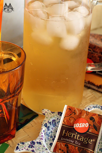 But when I went to Bali a couple of years back, I ventured around the supermarkets and found a box of Sosro Heritage Jasmine Tea. And they smell heavenly strong. I bought one, and brought it back here to Athens. And every summer, I make a bottle or 7 of these teas and let them chill in the fridge. Sugarless, of course, since I don’t drink sugar. But I usually provide a small jug of syrup by the side for George or anyone else who likes their drinks sweet.