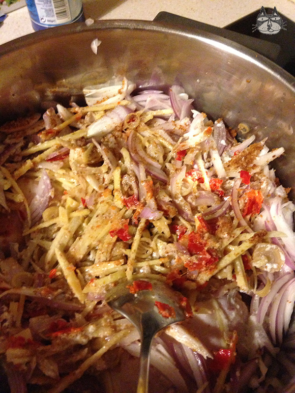 Simple chilli sambal paste, according to how lucky you’re feeling today, punk. I use 3-4 tbsp myself, depends how spicy the chillies are.