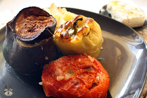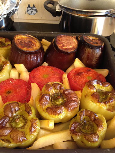 Gemista is a great dish to have during the summer, the tomatoes and peppers are excellent during this season. This is one of the first few Greek dishes that I mastered cooking – it isn’t as time-consuming as moussaka, and when I do make it, I make a lot so that it will last us for 2-3 days. Gemista is one of those dishes that taste better the next day, like curries and stews.