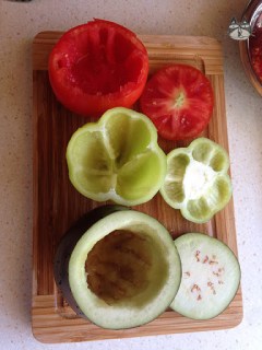 Cut the tops off, and with a spoon, scoop out the tomato flesh and seeds. Reserve it, even the juices. Chop it, and you can use it for the rice stuffing. For the peppers, cut the tops off and remove the seeds. For the aubergines, chop it like above and scoop the flesh out. You can keep the leftovers, flesh and seeds for ratatouille. (I kept mine to make an aubergine omelette for breakfast the next day) Make a cap with the leftover aubergines.