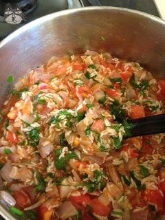 - Now to prepare the stuffing. In a pot, heat up the olive oil. Add the onions and sauté. Once translucent, add the rice and coat the rice in the oil. Add the tomatoes and parsley, and stir continuously. Season with salt and pepper, and then add the oregano. Once the liquid has been absorbed, remove from heat, and let cool.