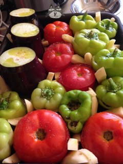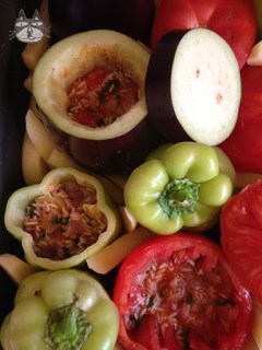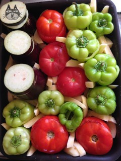 Enough peppers, tomatoes, aubergines and potatoes to fit a baking pan. Like so. The peppers were rather small here…