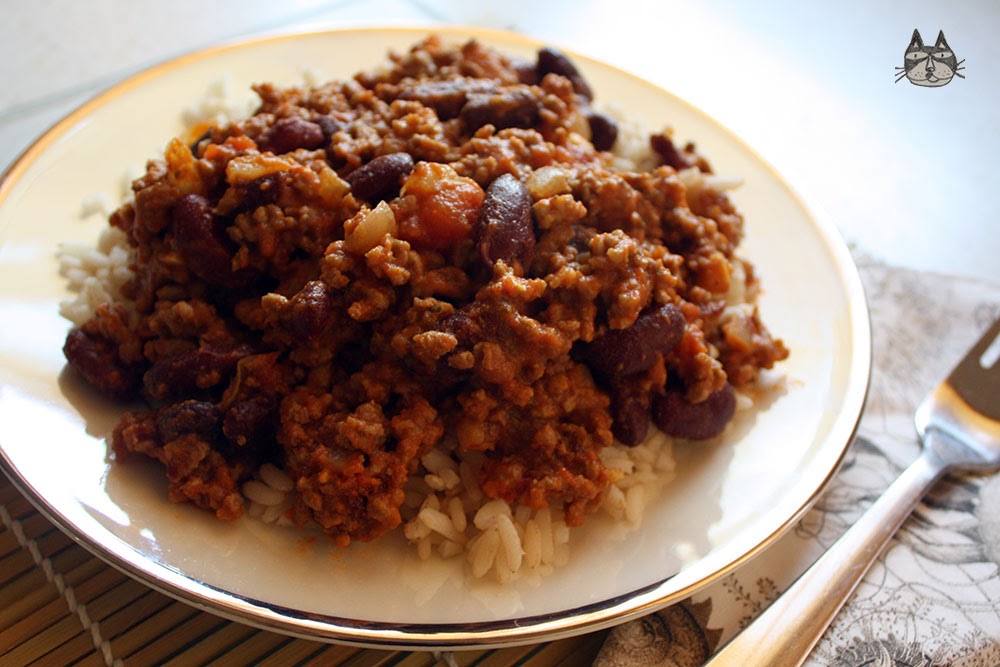 This dish has a special place in my culinary heart. I first tried this spicy tomato-meat concoction on top of a baked potato (jacket potatoes!) when I was 12 years old – in a small café, in a town called Loughborough, England. It was so exotic to me, to eventually taste this much sung about food (Let There Be Love by Nat King Cole). Fast forward by 7 years, and it was a staple meal for me at my university’s Student Union café. I love to eat it with rice, but you can have it on its own with bread (corn or otherwise), or as a Taco Salad topping.
