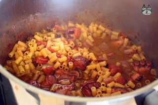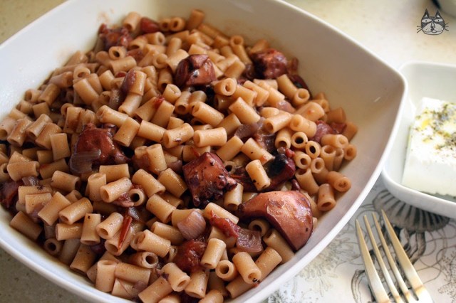 I can’t remember the first time I had octopus. I may have tried the rubbery plain kind you find on top of nigiri sushi back in Kuala Lumpur, but the first time I had octopus that didn’t try to dislodge my teeth was in a taverna in Thessaloniki, approximately 13 years ago. It was divine. Grilled, seasoned with olive oil and oregano. Heavenly smooth. That is the beginning of my love affair with this cephalopod mollusc. This dish is relatively simple. It’s extremely tasty, and it goes a long way if you are planning to have a dinner party that doesn’t require too much work, but still wow your guests. Here I have served it with small short macaroni like pasta – it goes well with this sauce, but you can serve it with crusty bread or rice, just omit the pasta adding stage and serve hot.