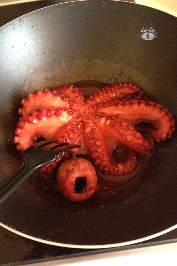 2. Pre-cook the octopus. Add it into a pot, cover and just braise it on medium heat. The octopus will cook in its own juices. Depends on the size of the octopus, but I check how soft it is with a toothpick/small fork after 20 minutes. If it’s a medium-large sized octopus you may need 30 minutes. You will end up with that:-