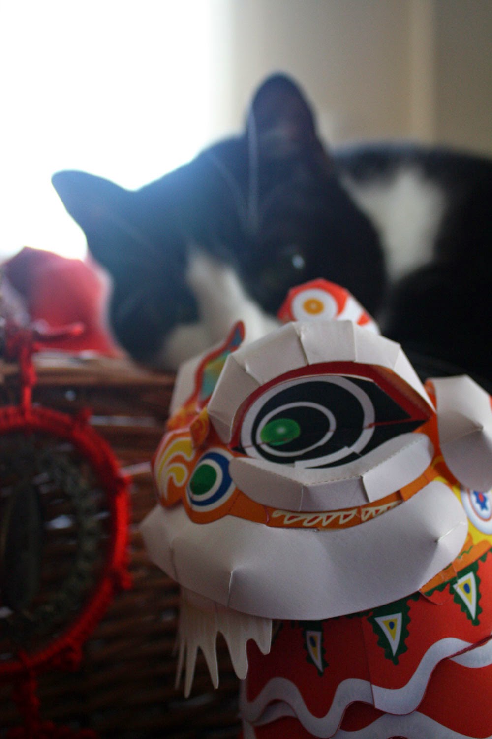 | Katiki says Gong Xi Fa Cai with a mini Chinese Paper Lion |