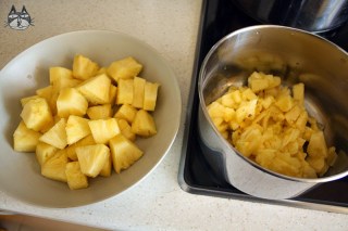 2. Add in a small saucepan, and check if there is enough liquid to cover the pineapple pieces. There usually is, but if not, add just enough water to cover.