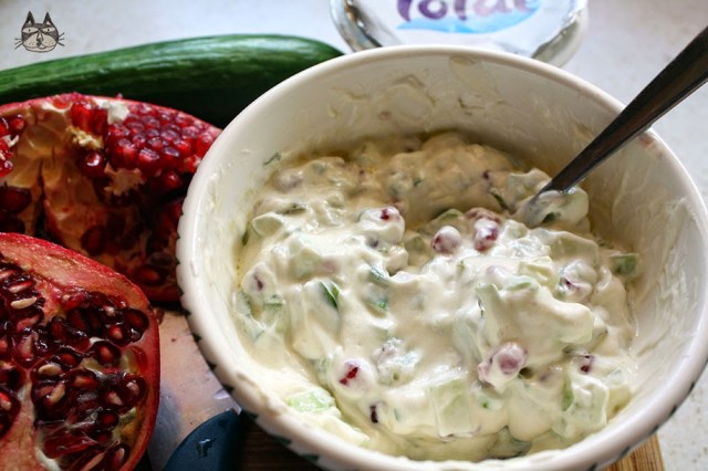 I love tzatziki. It’s very easy to make, and it tastes yummy! But there are times you don’t want to have garlic breath but also have the same kick of flavours in your dip. This is based on Nigella Lawson’s refreshing raita, using Greek Yogurt and pomegranate. I use the traditional tzatziki crunchy refreshing vegetable here – cucumber, and a few leaves of mint thinly sliced. It goes really well with spicy food – it helps cool down the tongue!