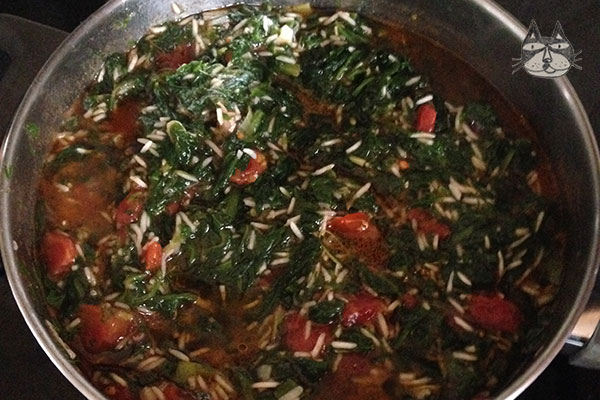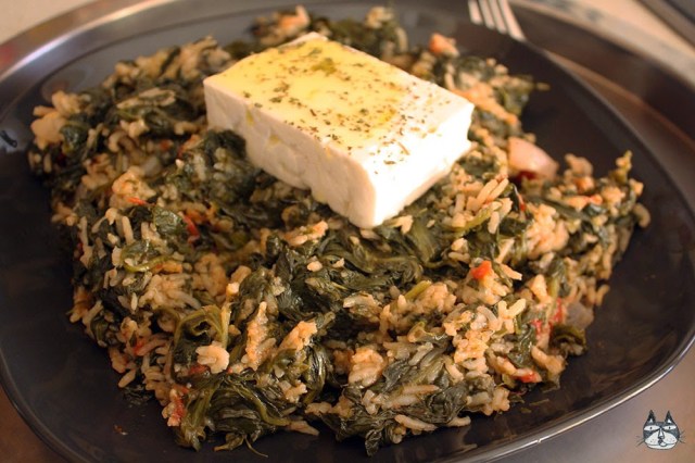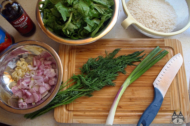 This spinach and rice dish has become one my favourite dishes to have when I feel the need to satisfy my rice cravings. I tasted this mostly vegetable dish for the first time at the age of 19, cooked by Elena (the same one who introduced me to Tzatziki) – she made hers with no tomato, lots and lots of lemon and garlic. Pictured above is the one where I added tomatoes in it (because George loves it with tomatoes and loathes the lemony kind). I usually make both, but the recipe here is the one I was given to by George’s grandmother about a decade ago. I have adapted to make it my own (by using basmati rice so its less soggy and a dash of Worcestershire sauce to the mix.). Adding the Worcestershire sauce doesn’t make it vegetarian anymore – it contains fish sauce, so its optional!