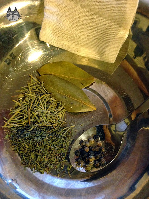 7. Return the warm browned meat into the pot. Stir to coat the meat with the onion mixture. Add any juices that are in the bowl, the water, wine, tomato paste, parsley and spice bag. Stir.
