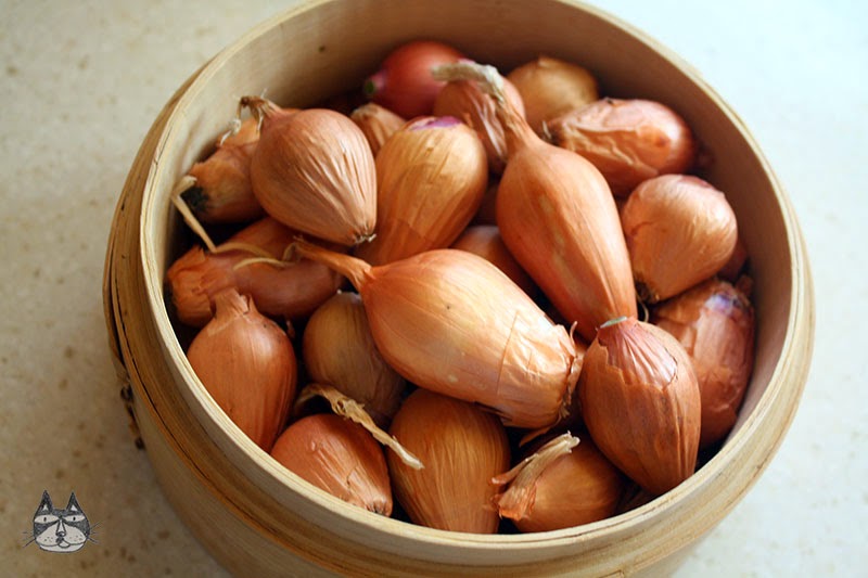 3. In the pan, add 1 tbsp of olive oil. Add the whole button onions/shallots and brown for about 3-5 minutes. Remove with a slotted spoon into a big bowl that can be covered.