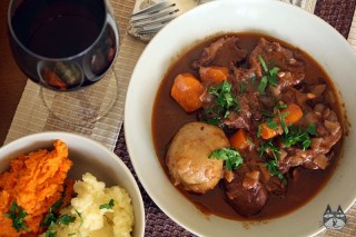 2. In a stewing pot, heat 1 tbsp of butter on medium heat until you can hear it partially sizzling. Brown the meat in batches and remove onto a plate and cover so it won’t cool off too fast.