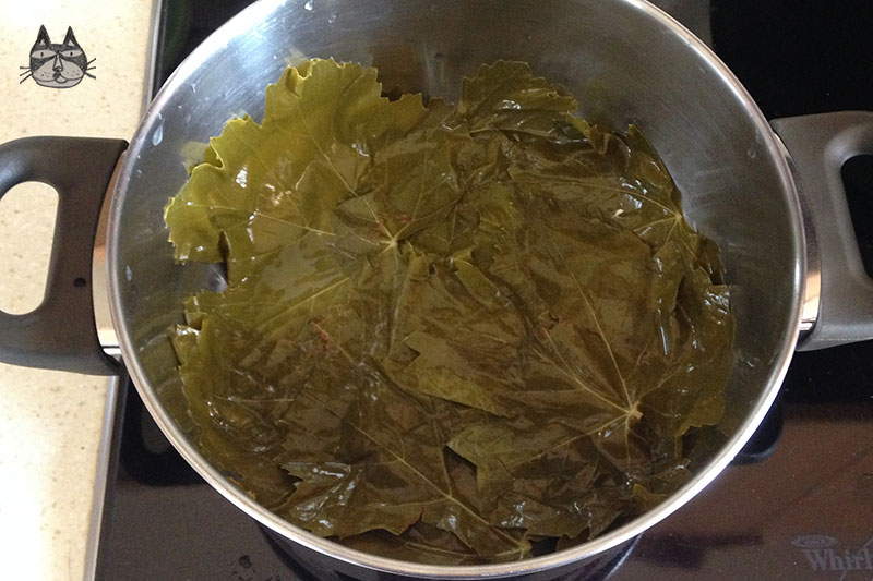 - When you have finished folding all of the vine leaves (you may have extra leaves), use the big vine leaves you set aside earlier to line the bottom of a big pot. The pot should ideally be short but big in diameter. But any big pot would do.
