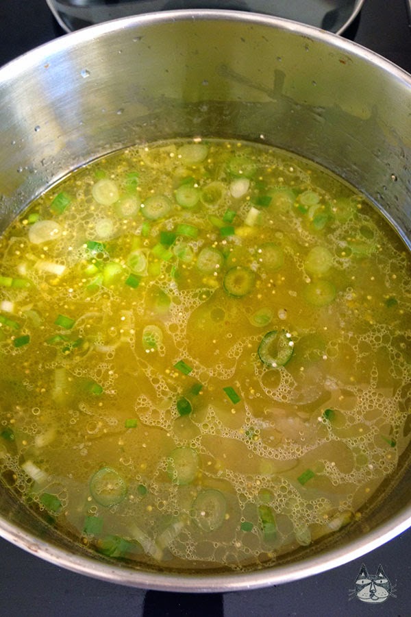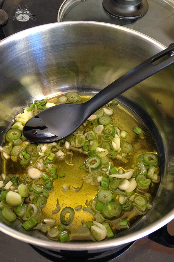 1. In a pot with a lid, heat up the olive oil. When its hot, saute the spring onions, garlic and ginger until fragrant.