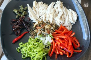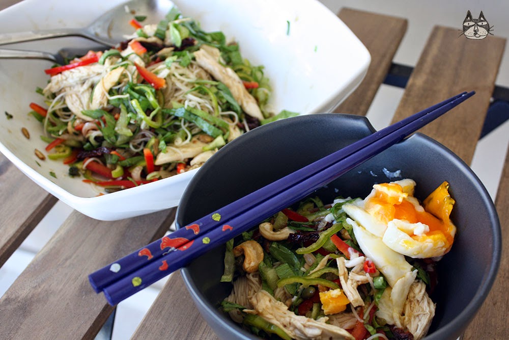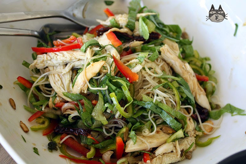 Summer in Greece is hot. Summer in Greece makes it suitable for yummy salads as a whole meal in itself. I was feeling peckish, craving for vermicelli bihun noodle soups that I loved to eat back in Malaysia. I had one ‘bihun’ packet left in my store cupboard, and some leftover roasted chicken in the fridge. This dish is easy to make, you can use any vegetable that you have (tomatoes, cucumbers, avocados.) I have included sliced sundried tomatoes and capers in this dish to make it an East meets West mix (but also as a salty additive since I am out of fish sauce). Be daring, experiment!