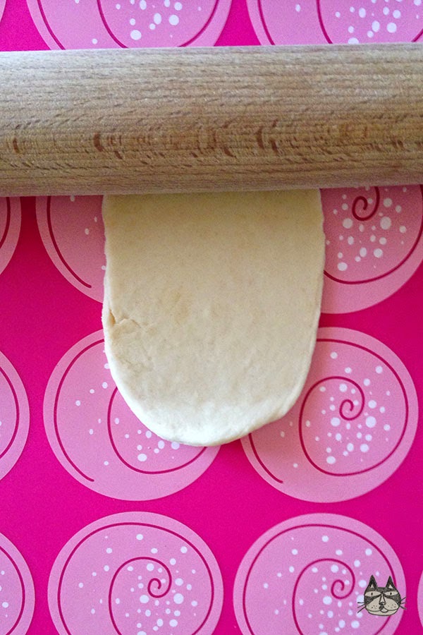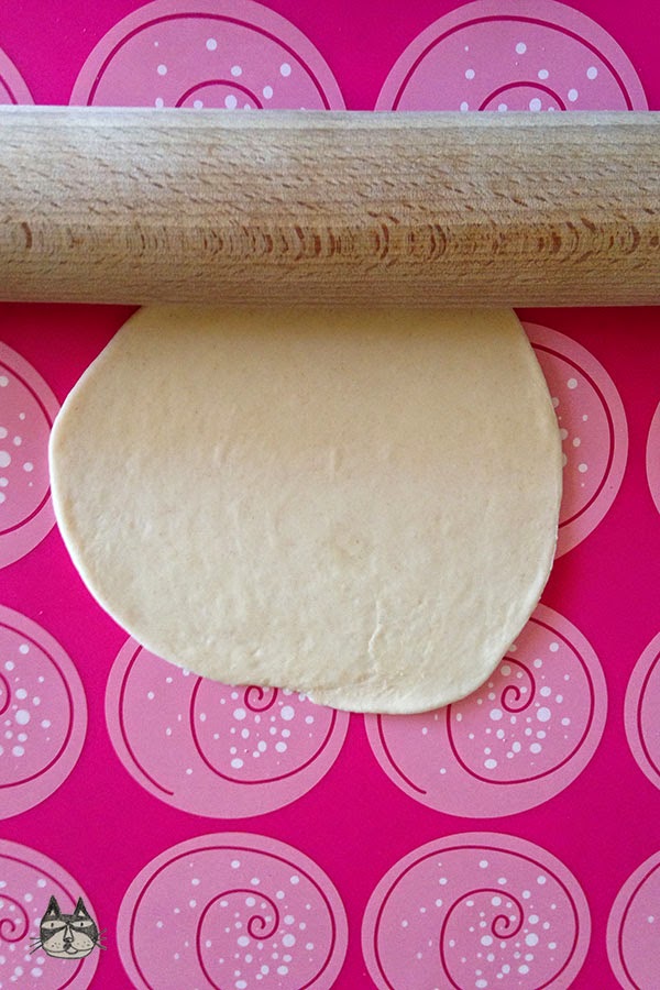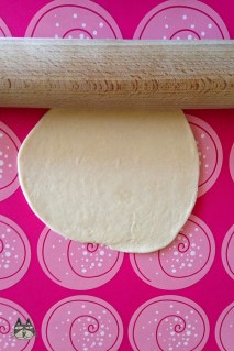 7. Roll out the dough into a thin sheet, making sure the dough stays circular. To make it easier, you can roll the dough in between 2 baking sheets.