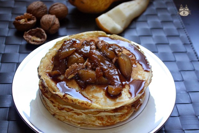 8. Once ready to serve, add the pancakes on a plate and garnish with the caramel pears and walnuts.