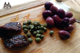 Recently, I bought a jar of tapenade from the supermarket and I was severely underwhelmed by the quality. I had them with bread sticks, on bread rolls, but it was rather bland. I remember that I made a tapenade with capers and sun-dried tomatoes that I brought to my friends’ Jennifer’s dinner party last year. Traditionally tapenades may contain anchovies, and since Jennifer is a vegetarian I had to improvise. And what a great result.
