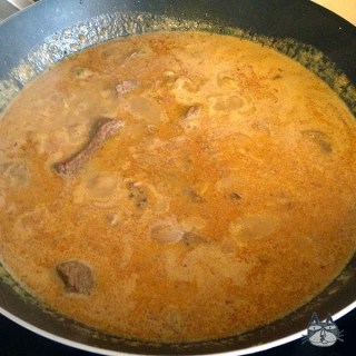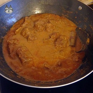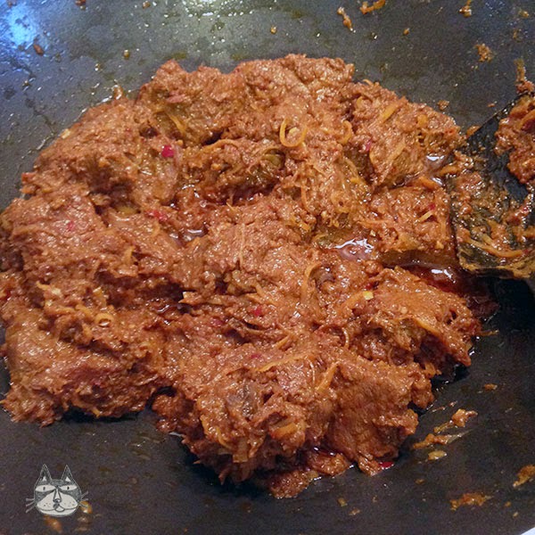 5. Bring mixture to a boil, and reduce the heat to low. Cover and simmer gently for 2 hours or until the meat is tender. I had it covered for the first hour, and had it uncovered for the 2nd. Take care to stir the rendang once in a while to prevent sticking/burning at the bottom of the wok.