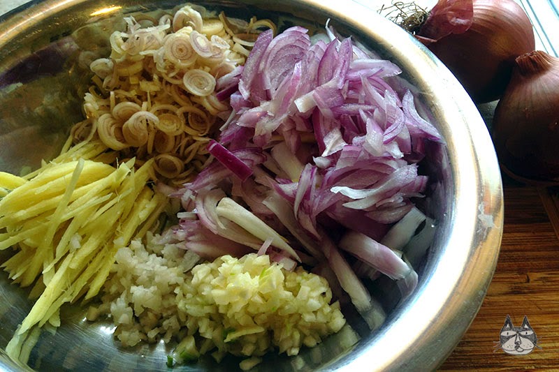 It does require a lot of preparation and a lot of care while cooking, but the result is worth all the effort. You can use a blender to make a paste of the onions, lemongrass, garlic, galangal and ginger, but I am keen to follow my grandmother’s advice – slice the ingredients by hand.