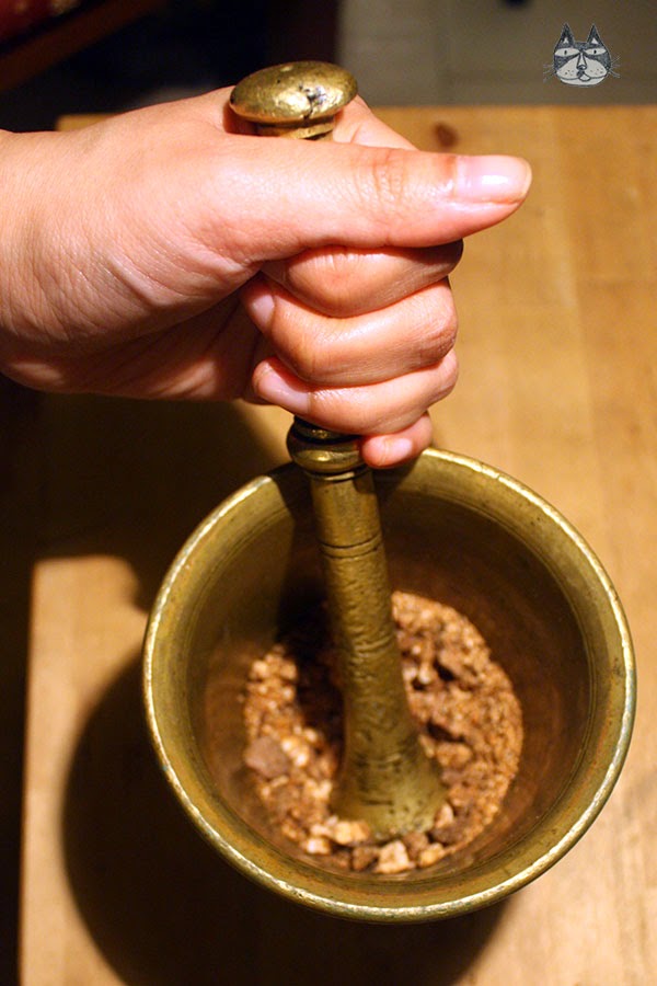 Of course the cinnamon and the nutmeg needed a bit of bashing into smaller pieces. You can use a mortar and pestle, or put them in a freezer bag and use a rolling-pin and beat the bag until the spices are broken.