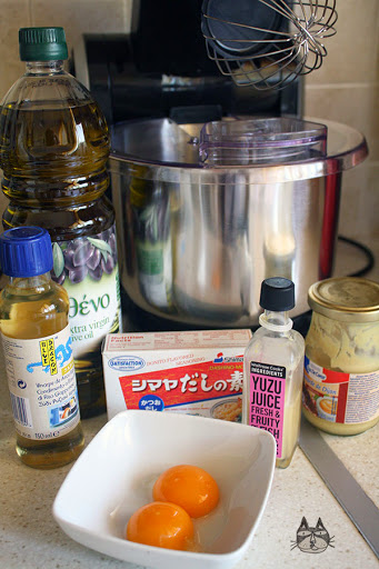 - In a bowl, place 1 tbsp of the rice vinegar, the yuzu juice, salt, mustard, dashi powder and the sugar. Whisk until it’s all mixed.