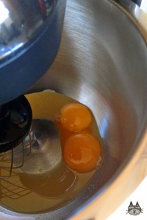 - Place the egg yolks in the mixer bowl, and add the whisked mixture into it. Start the mixture on slow.