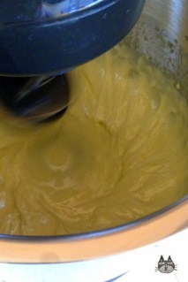 - While the mixer is on slow-medium slow, gently and slowly trickle the oil into the mixer.