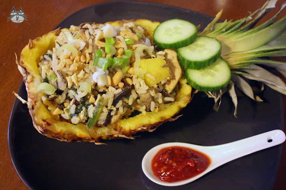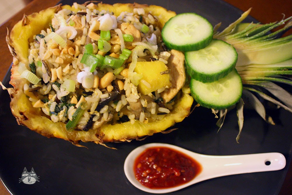 7. Remove from the heat and serve in the hollowed out pineapple shell – or on a plate if you used canned pineapples. Garnish with the chopped peanuts and spring onions. Have a side dish of sambal or chilli sauce if you want to have a spice kick!
