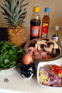 So, I will now attempt one of the recipes in the book, or I should say adapt. The recipe asks for canned pineapples (which you can use) and seafood like prawns and squid. This version is with chicken, mushrooms, spinach and red peppers. You can use any vegetables that you like in fried rice – I used what I had in my fridge. It’s best to test different textures – the red peppers add a crunchy sweetness to the dish, and you can use diced carrots or sliced long green beans too.