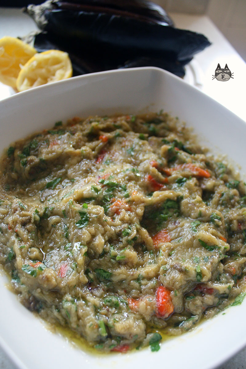 - In a big bowl, add the drained aubergine flesh, the chopped red pepper, the parsley, the lemon and garlic mix, and stir while gradually pouring in the olive oil. Add more (or less) olive oil, if you want.