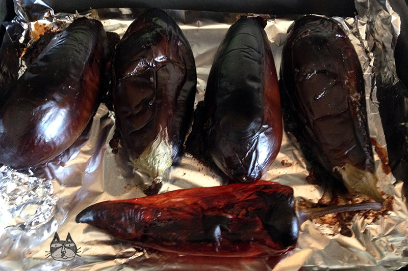 This dish is great to make if you have a barbecue going in the garden, and you can roast/toast the aubergines and the pepper on the grill and it will char beautifully. But since it is still quite chilly outside, I had to make do with an oven with a grill function.