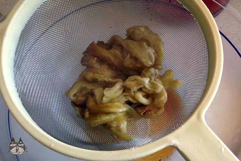 - Once the aubergines and peppers are ready, make a cut lengthwise into the aubergines, and leave it to cool slightly so you won’t burn your fingers when you touch them.
