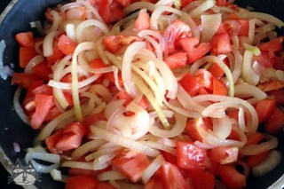 - Add the diced tomatoes, sugar and oregano, and cook until soft.