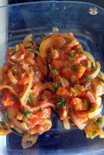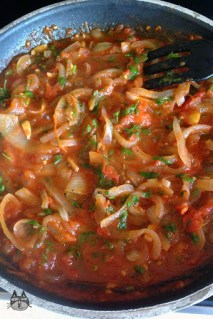 - Cover the aubergines with a thick layer of the onion and tomato mix. There should be enough liquid to cook the aubergines, but if your mixture is rather dry, add about half a cup of water at the bottom of the tray.