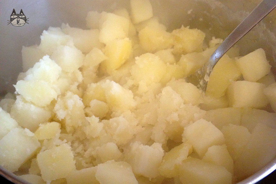 - Transfer the potatoes back into the pot, and use the back of a fork to mash it into pieces. Alternatively, if you have a potato ricer, use that.