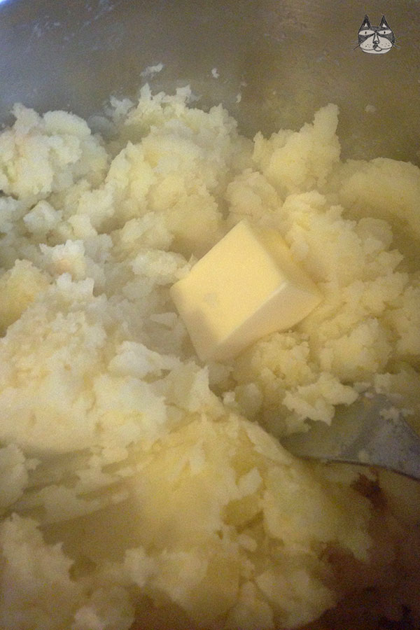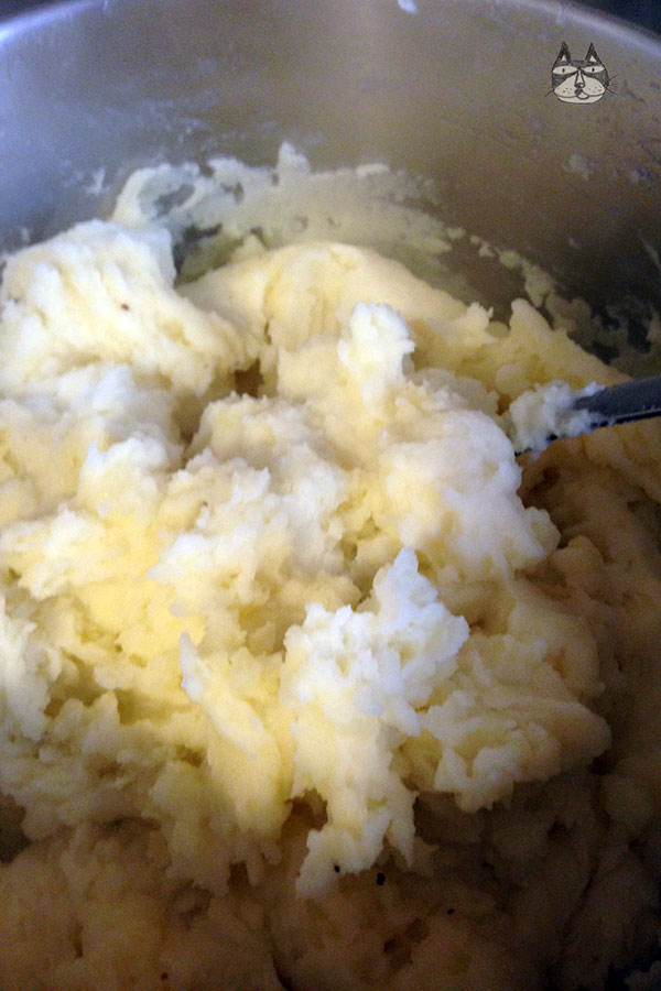 - In a bowl, whisk together the cream and the milk. Add that into the potatoes and while mixing, add the knob of butter.