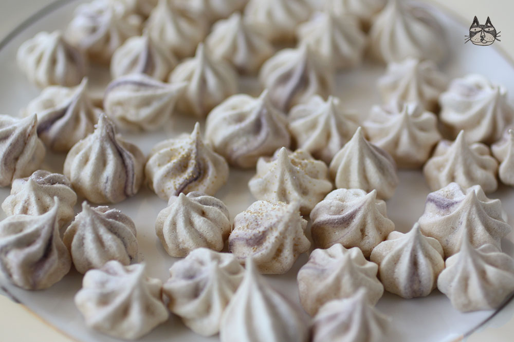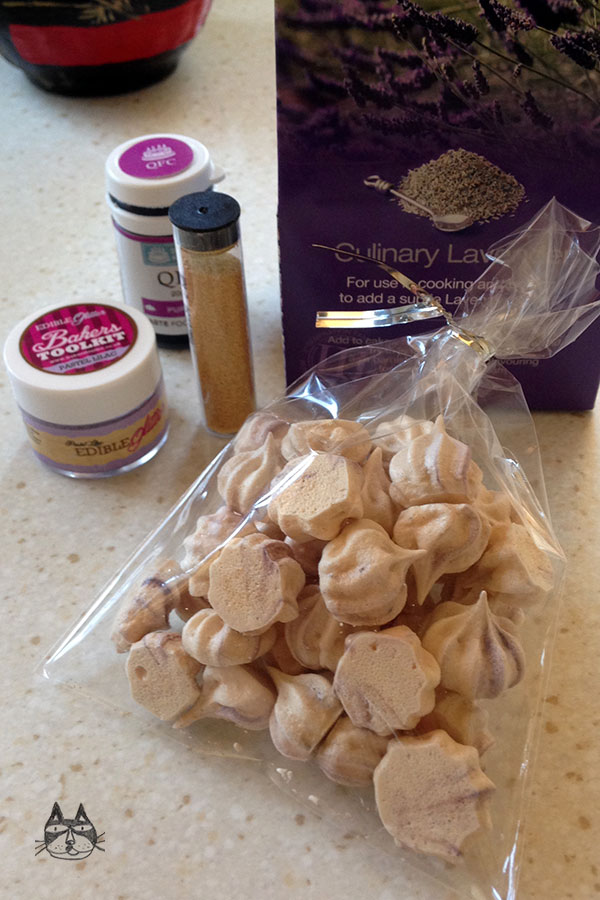 Eliza is a darling friend of mine – we have similar tastes (in clothes, men and food, too!) and I decided to create these little meringue ‘gems’ for her about a year ago. I based them on a recipe I saw on TV by Hope and Greenwood (Sweets Made Simple), but I decided to use some Lavender as a flavouring. I have a lot of Lavender buds, and I ground them down with some sugar in a pestle and mortar until it’s a fine powder.