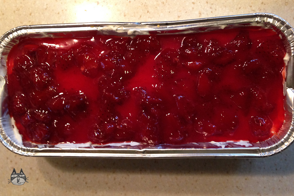 - Just before serving, spoon and spread the strawberry conserve/compote on top of the cheesecake.