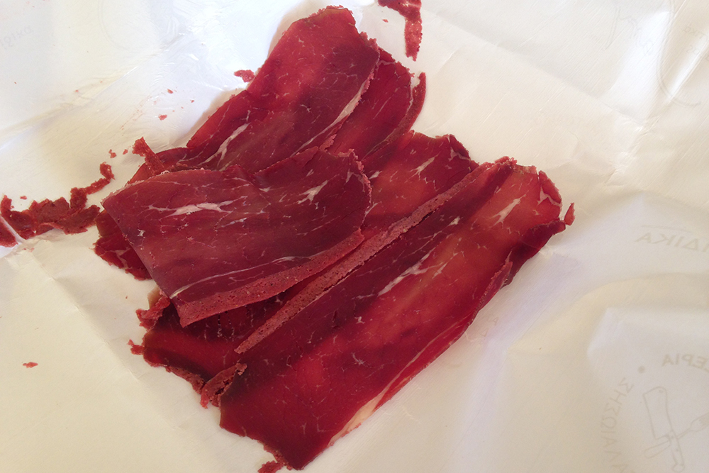 Sunday morning breakfast – fried eggs with pastourmas. It was incredibly tasty. How could I have not encountered this heavenly (albeit strong-smelling) morsel before this moment? I have been here in Greece for quite a number of years, and have heard of pastourmas (and eaten it too, I suppose, yet not knowing what exactly is it that I am eating!), but I have to say this trip to the store really opened my eyes, and I thoroughly recommend you to check out Arapian, and ask for Andreas! He was extremely helpful, and we had a wonderful time tasting all the wonderful meats on selection.