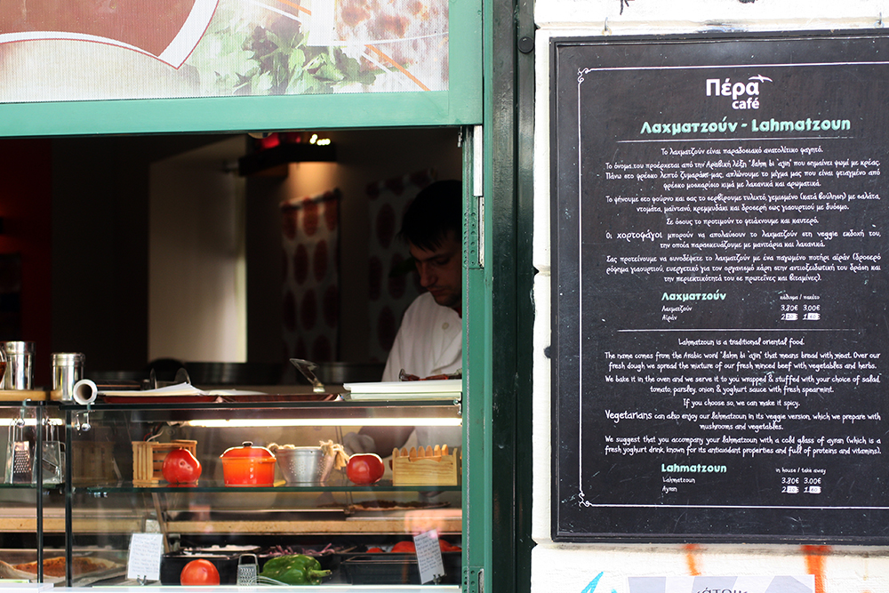 I spent an afternoon recently with Alison from Viv@ellada in downtown Athens, wandering about and trying different food. Alison will have a post about ‘cheap places to eat’ in Athens that I will link up here soon. (Update: Here it is! ‘Had Enough Of Souvlakis?“)I have decided to compile here some of the places that we went to, for food and for food shopping. The theme here is Eastern Flavours, and I will tell you about Street Wok, a recent find for me, that I absolutely LOVE; Pera Cafe that serves really good Lahmatzoun; and Mirch, an Indian restaurant and take-away that serves really good Indian food – they have a Tikka/Tandoori oven that makes their chicken tikka and tandoor taste extra delicious! Also, a shop (a very famous one, too) that sells the speciality cured/dried meat Pastourmas – called Arapian. There is a connected restaurant Ta Karamanlidika Tou Fani that I would try some time in the near future.
