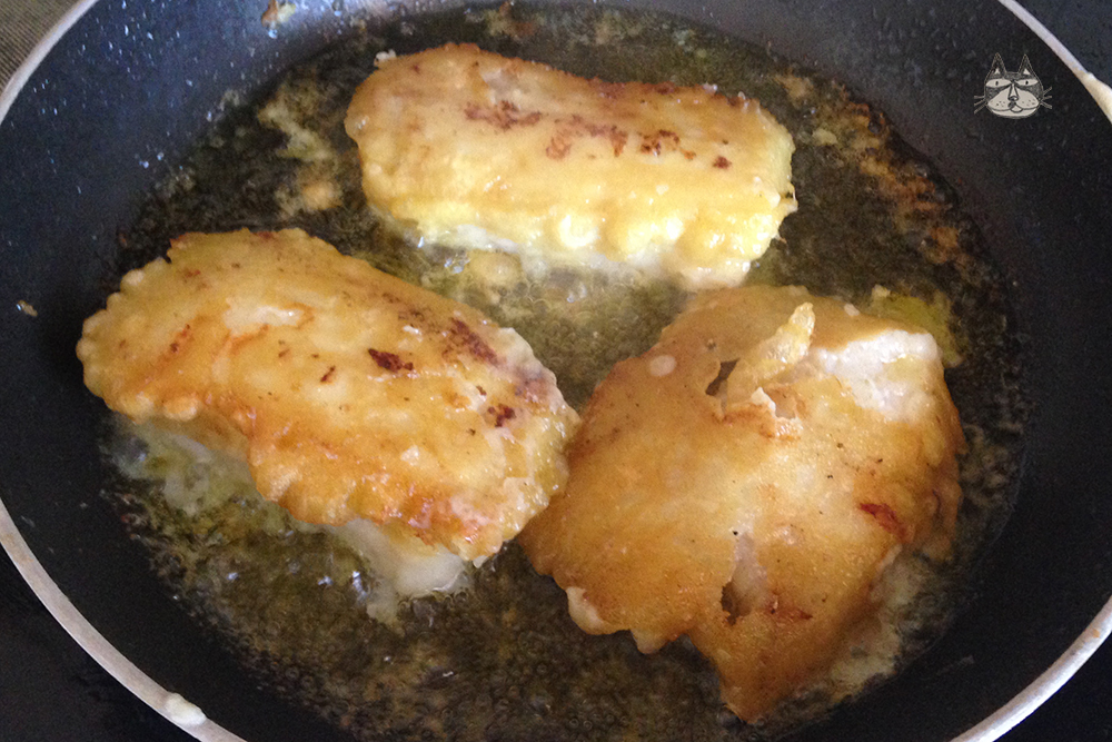 I didn’t have a big enough frying pan to fry the whole fillet of the cod, so I cut them into manageable pieces.