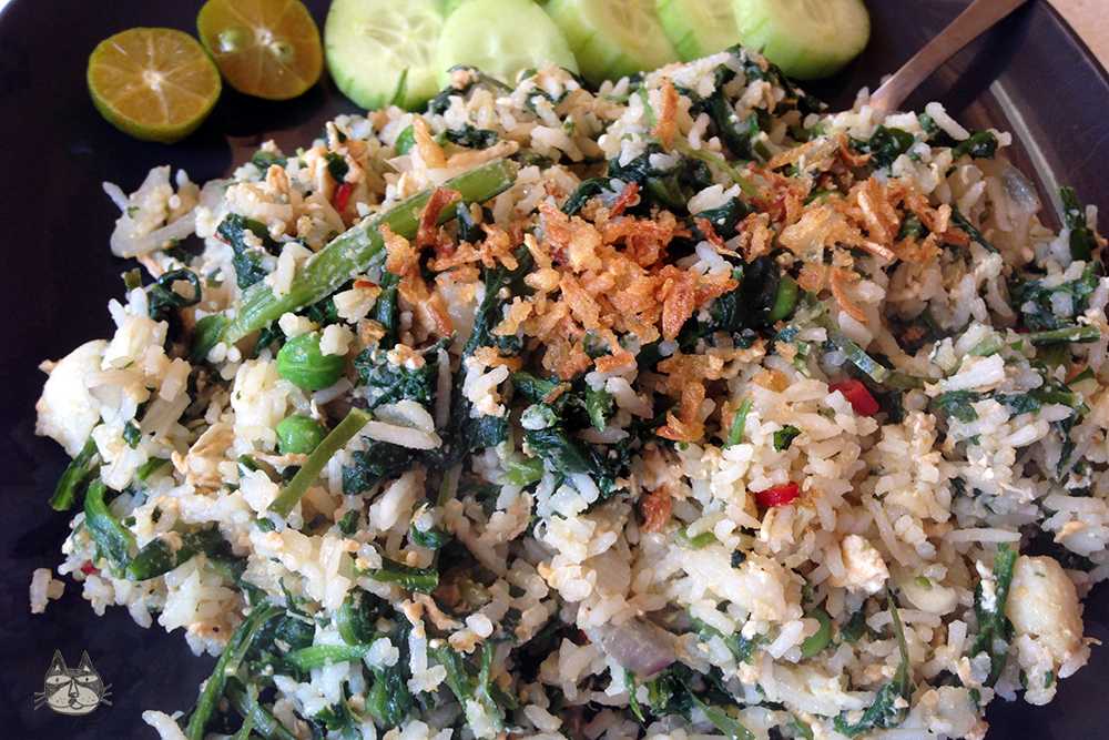 I added some sliced chillies in the mix (birds-eye chillies!) for spiciness, which you can omit if you don’t like it spicy and 2 kaffir lime leaves, sliced thin, to make the rice smell less fishy and slightly more fragrant. I served it with a garnish of sliced cucumbers and some crispy fried onions. I also had some kasturi limes (also known as calamansi) that you can squeeze on top of the rice just before eating – substitute with normal limes if you can’t find any kasturi limes. If you live in Athens, you can find kasturi limes from Farmer’s in Ambelokipi.