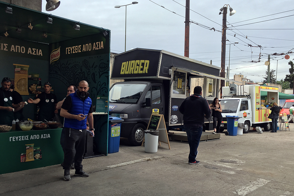 I went to see the Athens Street Food Fest earlier today (20th of May). There was a variety of food stalls there selling burgers, burritos and hotdogs among others. Even one of my favourite falafel shops, Not Just Falafel, can be found there! There are coffees by taf, and wonderful juices and quinoa burgers by Pure Bliss, Peruvian food (with their ‘Amazonian Kimchi’!) by La Pantera Negra, Monster Burgers, cupcakes from Emi’s cupcakes and of course, my usual take-away/delivery when I am at home, The Big Bad Wolf Souvlaki Bar with their, well, souvlakis. There are also food trucks, and an Asian food section by the food trucks, by Knorr.