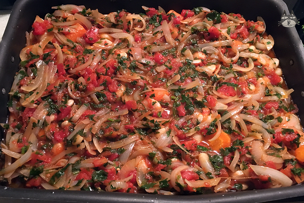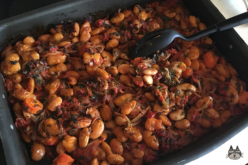 I have recently started a healthier diet, in combination with a new gym membership (my poor muscles). Pulses and legumes are a good source of protein, and the Greeks have a variety of baked dishes that are suitable for vegetarians and vegans. Healthy and yummy, this dish is great warm and cold, as a main dish or as a meze (a variety of dishes in small portions, like tapas). The gigantes beans (which means giant) can be found easily in shops – they also come in the “elephant” size, which is even bigger than the giant ones! They need to be soaked overnight, with a little bit of baling soda before you rinse and boil it slightly – this helps make it softer. Serve with bread and a side portion of feta cheese!