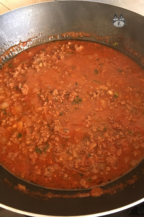- Meanwhile, in a large frying pan heat up 2-3 tbsp of olive oil over medium high heat, and cook the onion until soft. Add the garlic and cook for a couple of minutes until fragrant. Add in the minced meat, and cook until the mixture is rather dry. Stir in the tomato and wine, and bring the heat down to a simmer. Add the oregano, thyme, sugar and cinnamon stick. Stir and let cook.