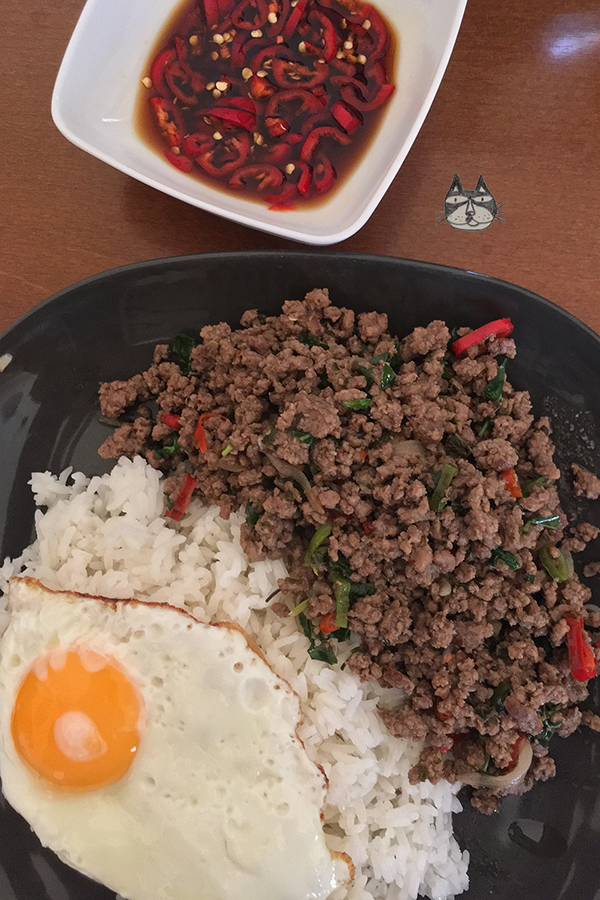 During my last visit to Malaysia, we stumbled upon the wonderful Boat Noodle at Heritage Lane, Damansara where there were beautiful little bowls of noodle soup in sweet and spicy soups. One of the dishes that caught my eye was the Thai Basil Chicken – minced chicken cooked in a spicy and very fragrant sauce served with rice. I have decided to make it with beef (because it is easier to find minced beef than minced chicken here in Greece – not impossible, but it’s easier.)