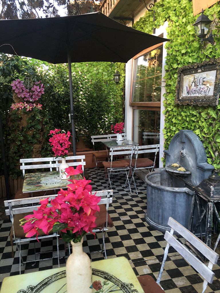 As you enter, you get into the garden courtyard, with a fountain. It is shady and has a considerable amount of seats. It is ideal, now that it is summer – and I sat outside once for hours just sketching the view around me. I won’t spoil the surprise by posting more pictures of the decor inside the café – it is something that you have to see for yourself!